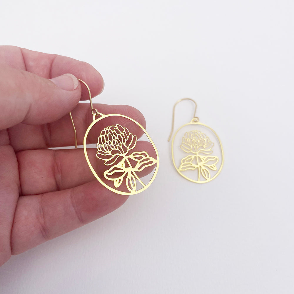 Celebrate native beauty with our Mini Waratah Flower Earrings in radiant gold. Featuring a hand-drawn design of the iconic Waratah bloom nestled within a delicate hoop, these earrings offer a subtle yet striking tribute to Australia’s unique flora. Crafted from super thin recycled stainless steel, they’re ultra-lightweight, hypoallergenic, and ideal for all-day wear.
