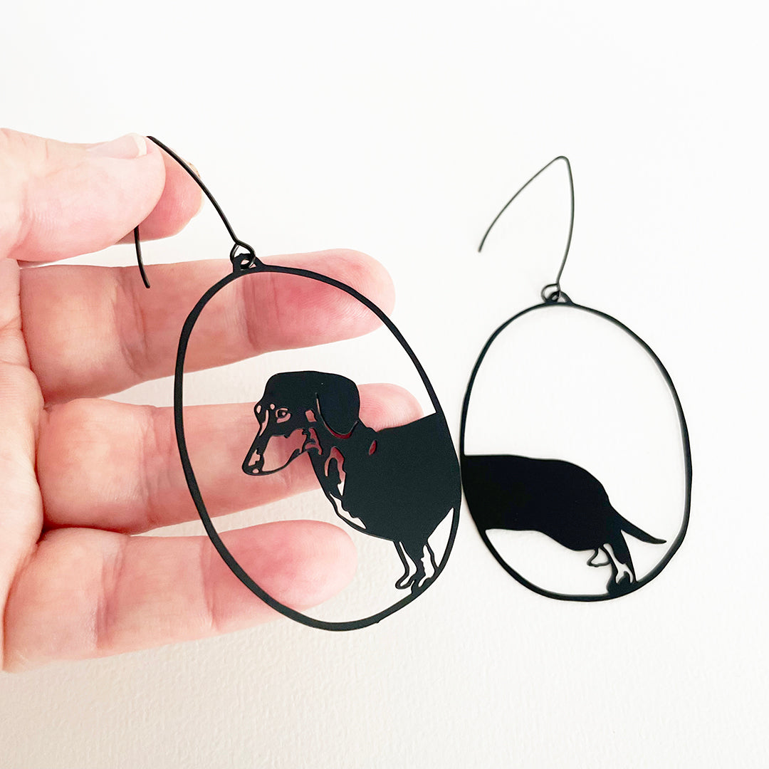 Say hello to the ultimate sausage dog statement, our Dachshund Earrings in classic black are a playful mismatched pair featuring one half of a dachshund on each hoop. Put them together and voilà! A full-length pup, complete with all the charm and character of the beloved sausage dog. Made from super thin recycled stainless steel, these earrings are lightweight, hypoallergenic, and seriously cute.