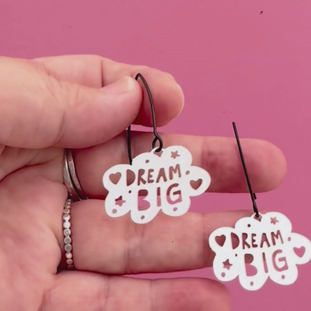 Dreamy and full of positivity, our Mini Dream Big Cloud Earrings in White are a little reminder to keep your head in the clouds (in the best way possible). These sweet minis feature hand-drawn cloud shapes with the words Dream Big cut out, surrounded by tiny hearts, stars, and dots for extra whimsy. Made from super thin recycled stainless steel, they’re the perfect lightweight pick-me-up for your everyday look.