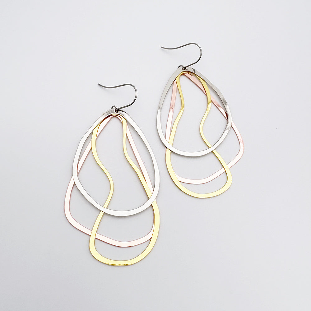 A little bit gold, a little bit silver, a little bit rose—our Tri Shape Dangle Earrings in mixed metals are the ultimate trio of effortless style. Made up of three organically hand-drawn shapes stacked together, these statement earrings blend warm and cool tones for a look that goes with absolutely everything. Crafted from super thin recycled stainless steel, they’re ultra-lightweight, hypoallergenic, and designed to move with you.
