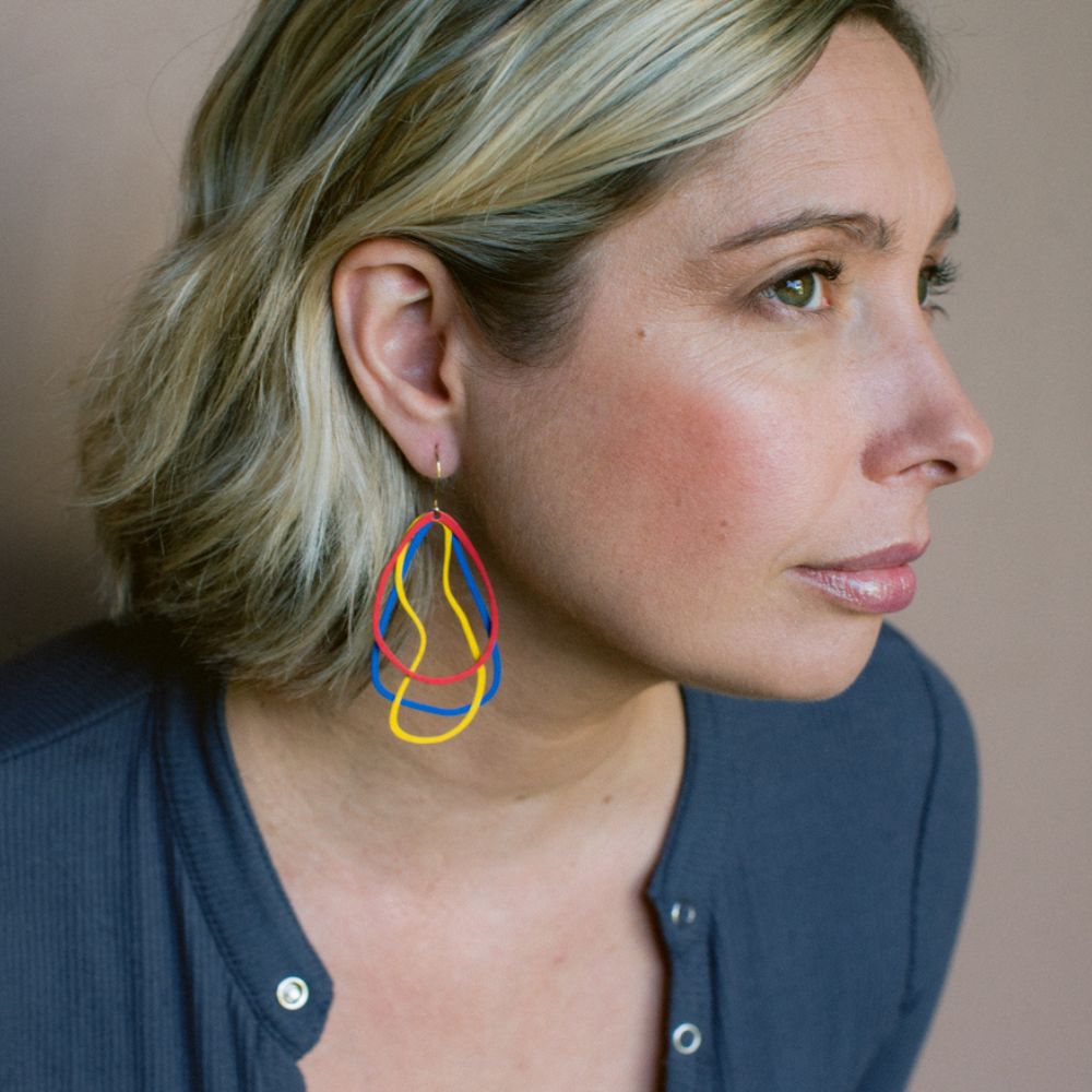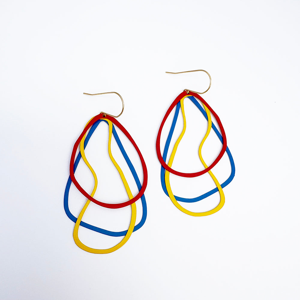 Playful, arty and full of colour—our Tri Shape Dangle Earrings in bold colours are here to brighten your day. Made up of three organically hand-drawn shapes in yellow, blue and red, these earrings are a joyful blend of movement, form and colour. Crafted from super thin recycled stainless steel, they’re ultra-lightweight and designed for all-day comfort.