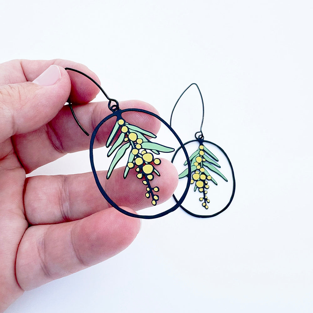 Midi Wattle Flower earrings in Black/Yellow/Green