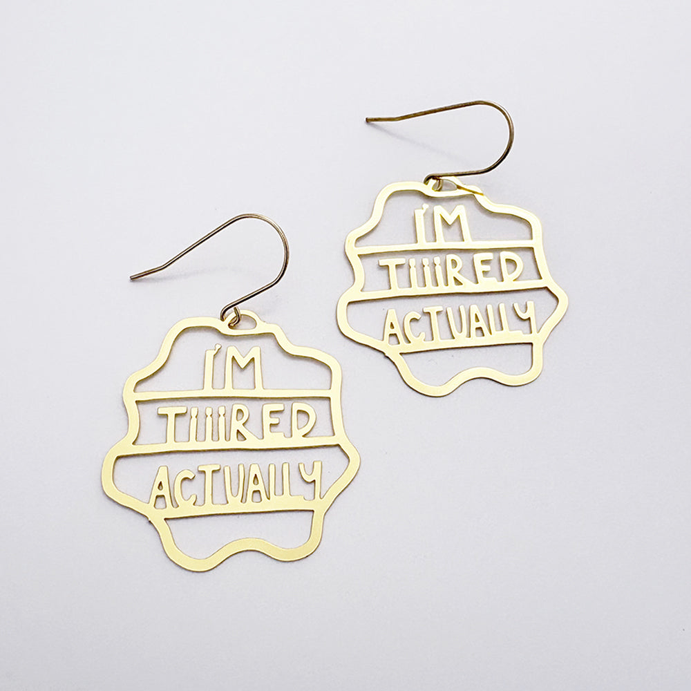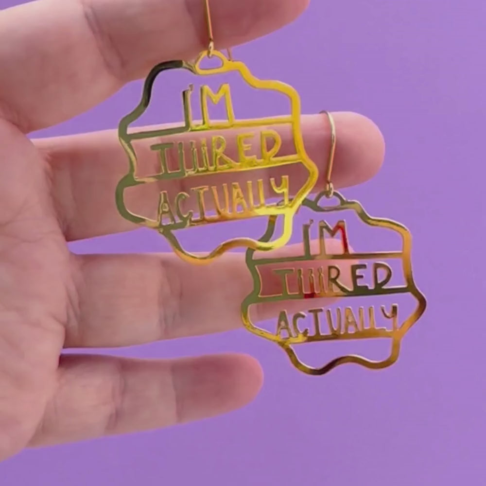 Channel your inner Prude & Trude with our Midi I’m Tiiired Actually Earrings in Gold, because sometimes, we’re all just a bit tiiired, actually. Featuring a wavy hand-drawn hoop and our signature cut-out text, these earrings perfectly capture that gloriously dramatic energy in a playful, wearable way. Made from super thin recycled stainless steel in stunning gold, they’re as light on your ears as they are heavy on personality.