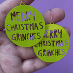 Cheeky and festive all at once, our Merry Christmas Grinches Earrings are here to spread a little sass this holiday season. With bold hand-cut text reading “Merry Christmas Grinches” set against a vivid Grinch-green base, these playful earrings are as lightweight as they are fun. Made from super thin recycled stainless steel, they’re hypoallergenic, comfortable, and guaranteed to turn heads at every Christmas gathering.
