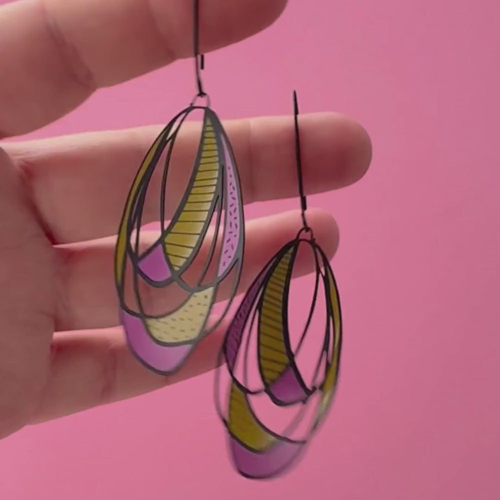 Bold, graphic, and unapologetically playful, our Art School Drop Out Earrings in Warm are a wearable nod to modern art and creative rebellion. Featuring a hand-drawn composition of mixed shapes with pops of pink and orange against a black base, this design feels like a tiny abstract artwork you can wear. Crafted from super thin recycled stainless steel, they’re ultra-lightweight, hypoallergenic, and perfect for everyday creative expression.