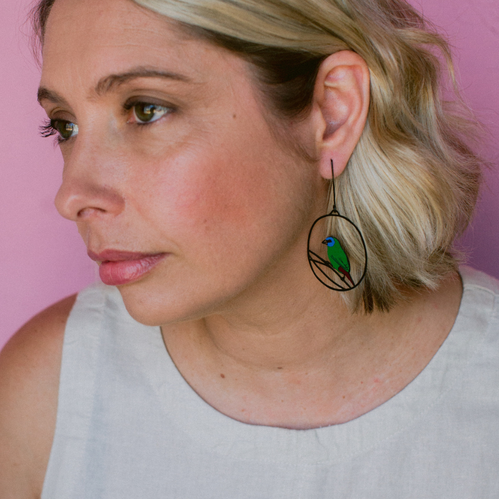 Bright, bold and full of charm, our Midi Blue-Faced Parrotfinch Earrings bring the tropical magic of this vibrant little bird to your everyday look. Featuring a hand-drawn Blue-Faced Parrotfinch perched on a branch inside a hoop, each pair showcases striking pops of green, blue and red against a clean black outline. Made from super thin recycled stainless steel, they’re wonderfully lightweight, hypoallergenic and perfect for all-day wear.