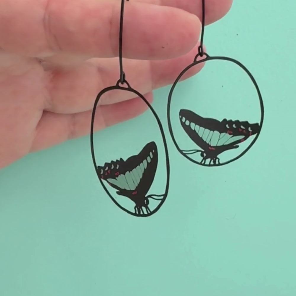 Cool, calm and effortlessly striking, our Midi Butterfly Earrings in Blue Triangle celebrate the quiet beauty of one of Australia’s most graceful butterflies. Featuring a hand-drawn Blue Triangle perched inside a hoop with its wings raised to reveal the underside, this design showcases rich black with subtle blue detailing for a refined, nature-inspired finish. Crafted from super thin recycled stainless steel, they’re ultra-lightweight, hypoallergenic and perfect for all-day wear.