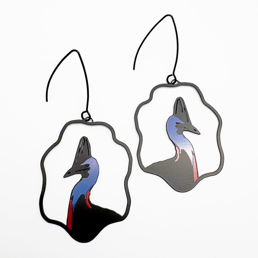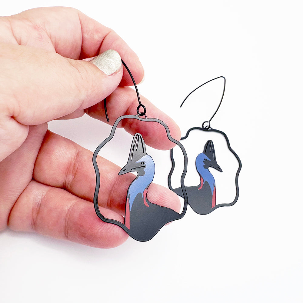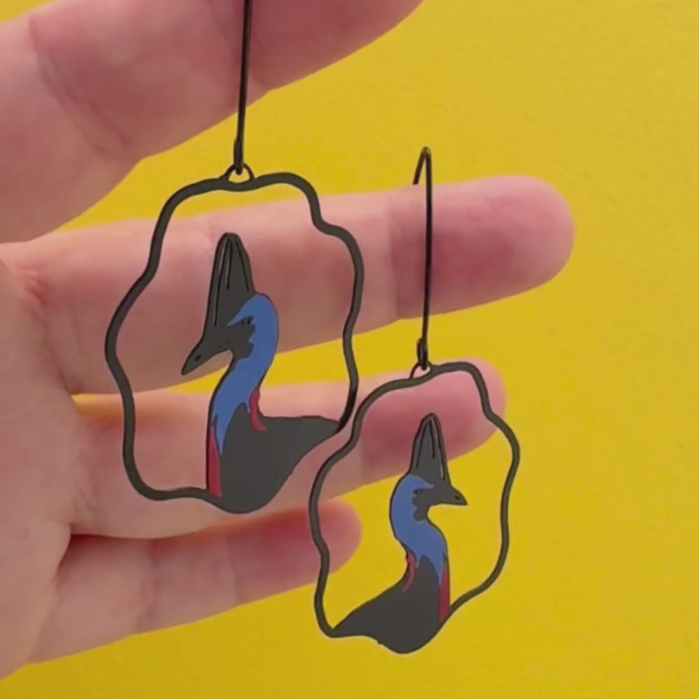 Bold, vibrant and impossible to ignore, our Midi Cassowary Earrings celebrate one of Australia’s most striking and iconic birds. Featuring a hand-drawn cassowary head, neck and shoulders framed inside a wavy hoop, this design showcases its unmistakable bright blue neck and vivid red wattles against a sleek black base. Made from super thin recycled stainless steel, they’re wonderfully lightweight, hypoallergenic and perfect for all-day wear