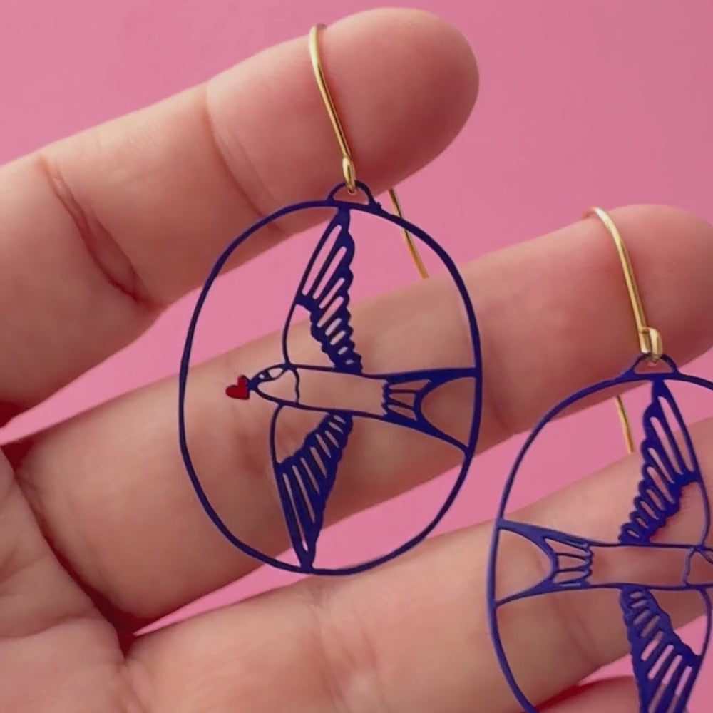 Hopeful, heartfelt, and full of meaning, our Midi Love Swallow Earrings in Blue & Red are a sweet symbol of love in motion. Featuring a hand-drawn hoop with a swallow mid-flight, each bird carries a tiny red heart in its beak, creating a design that feels both romantic and uplifting. Crafted from super thin recycled stainless steel, these earrings are beautifully lightweight, easy to wear, and designed to make a quiet but powerful statement