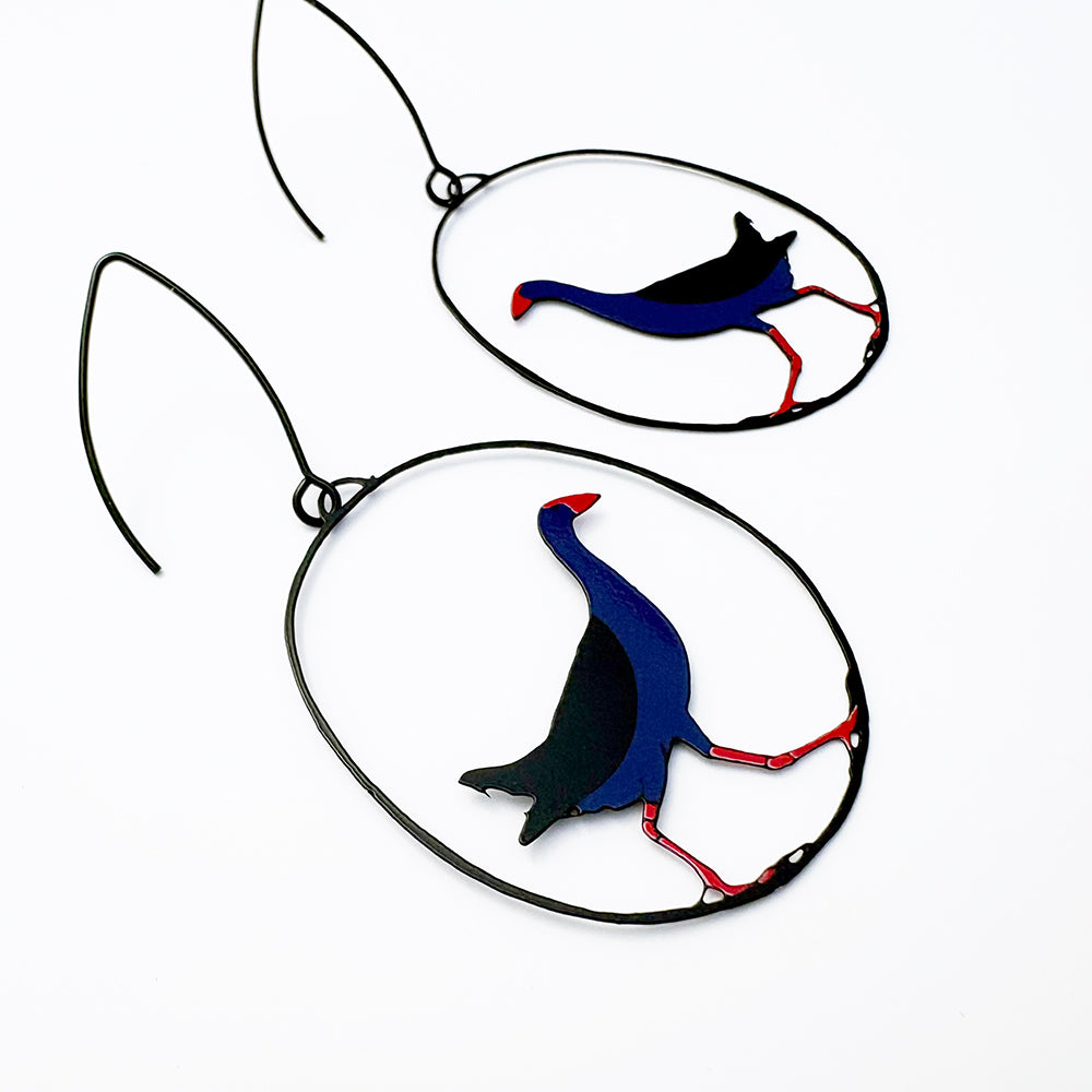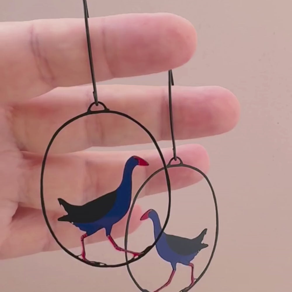 Bold, lively, and full of personality, our Midi Swamp Hen Earrings in Black, Blue & Red capture the unmistakable energy of this iconic wetland bird. Featuring a hand-drawn hoop with a sprinting swamp hen inside, this design highlights the bird’s deep blue body and bright red details against a sleek black base. Made from super thin recycled stainless steel, they’re ultra-lightweight, hypoallergenic, and perfect for comfortable everyday wear.