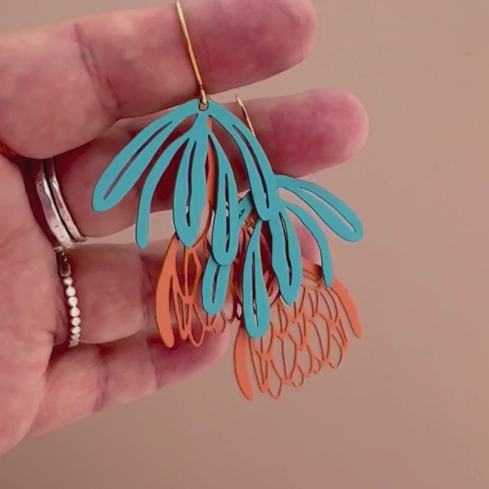 Protea flower dangle earrings in Teal/Orange